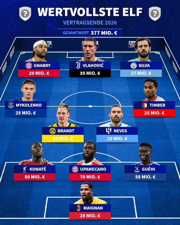 12月31日讯 德转列自明日起可以与其他球队谈判夏窗免签加盟的球员阵容,这些球员当前的合同都将在2026年6月30日到期,弗拉霍维奇、格伊、于帕梅卡诺在列。